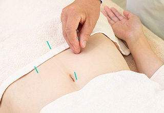 マッサージの後は、症状に合わせてお腹・足に鍼をします。